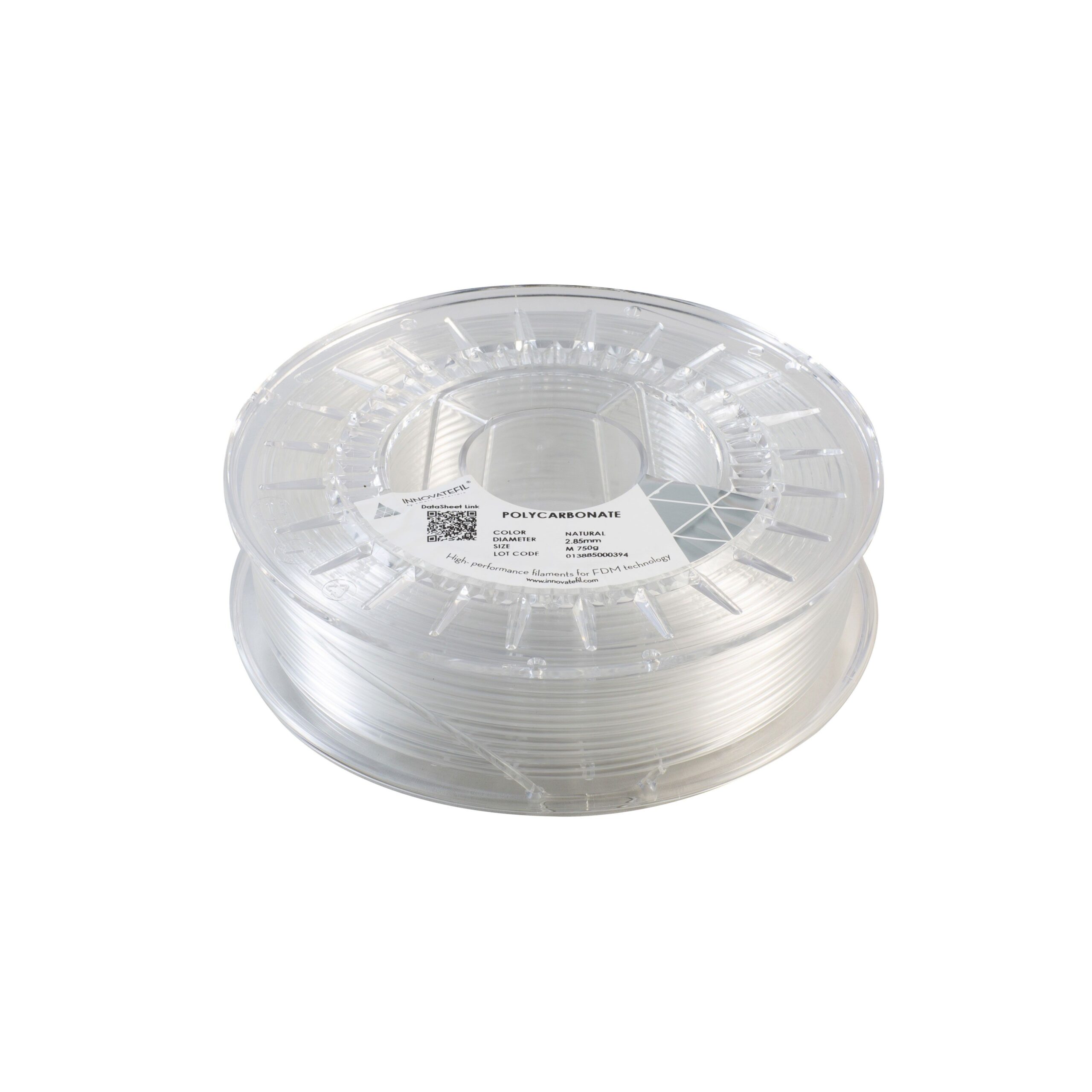 Filamento PC con elevada resistencia a impacto y temperatura, óptimo para piezas técnicas exigentes. Disponible en color Natural, diÔmetro 2.85 mm, bobina de 750g.