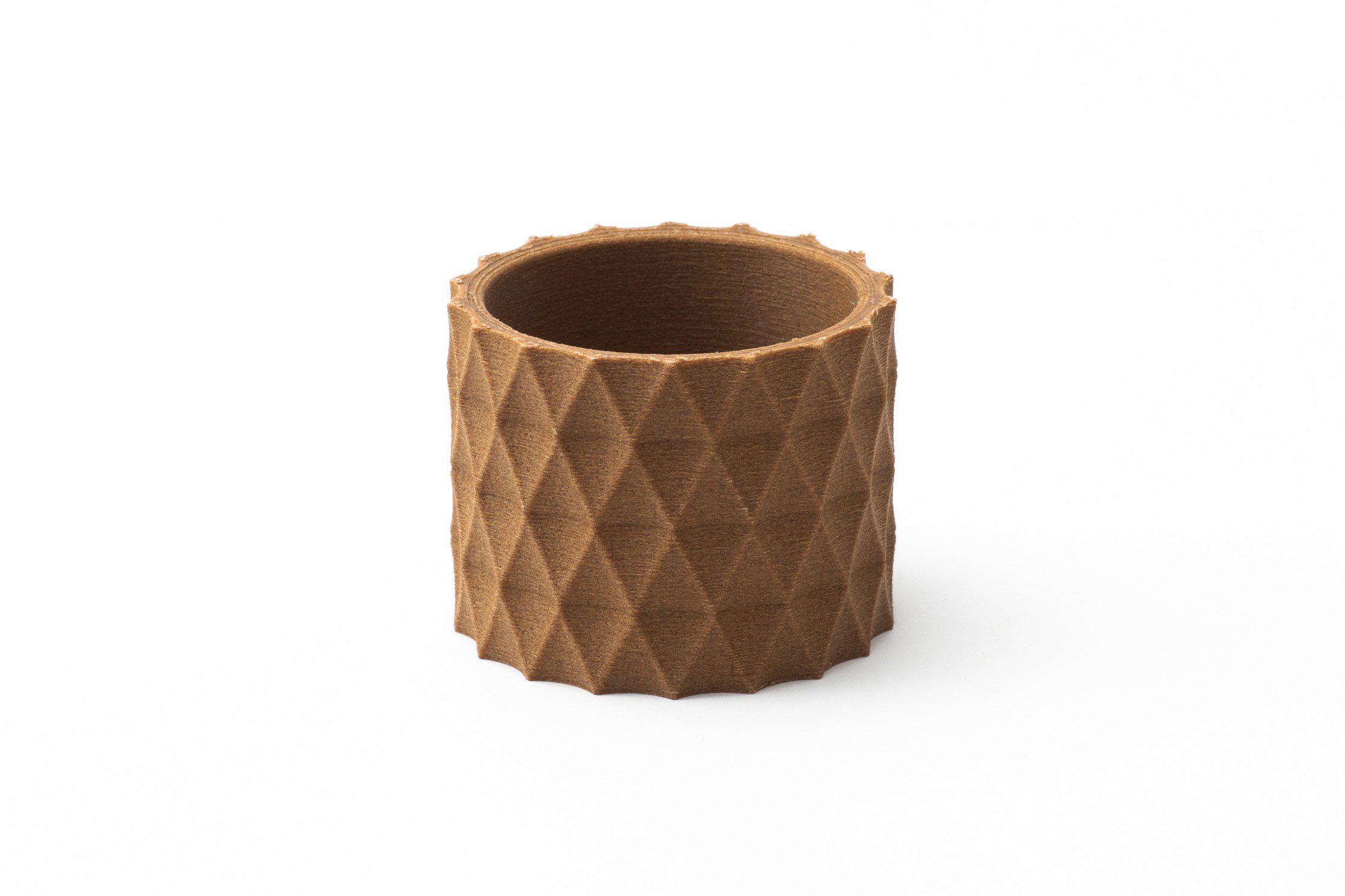 Filamento PLA con carga de biomaterial procedente de hueso de oliva, biodegradables y con estƩtica natural. Disponible en color Natural, diƔmetro 2.85 mm, bobina de 750g.