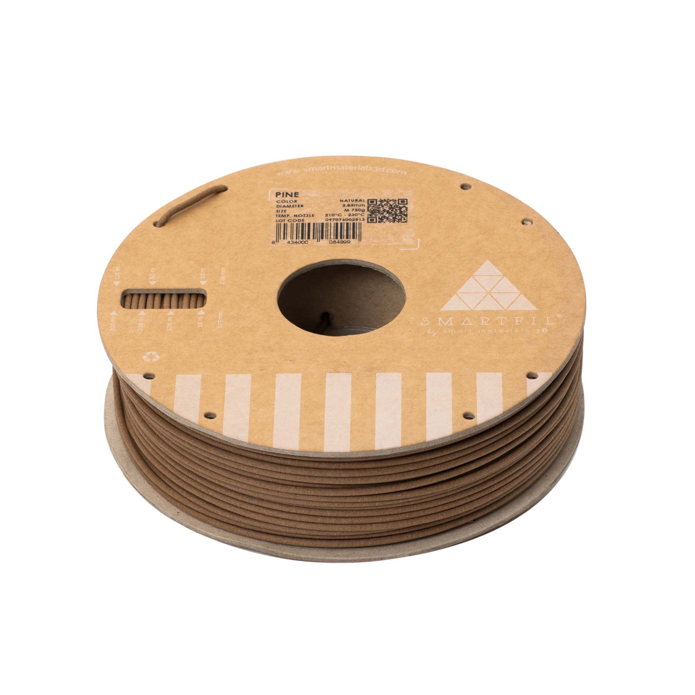 Filamento PLA con carga de madera de pino para acabado natural y cƔlido. Disponible en color Natural, diƔmetro 2.85 mm, bobina de 750g.