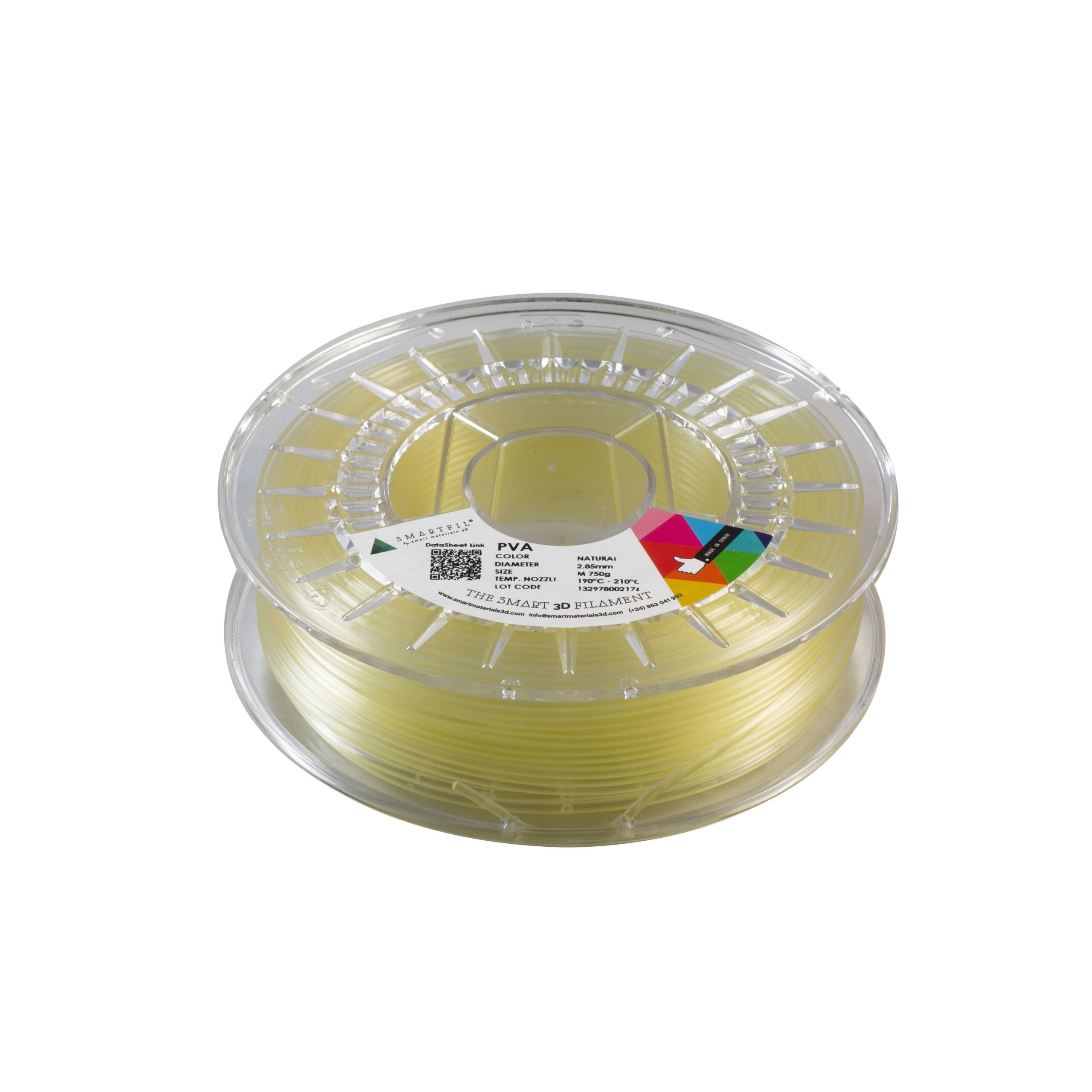 Filamento PVA soluble en agua para soportes en piezas complejas. Disponible en color Natural, diƔmetro 2.85 mm, bobina de 750g.