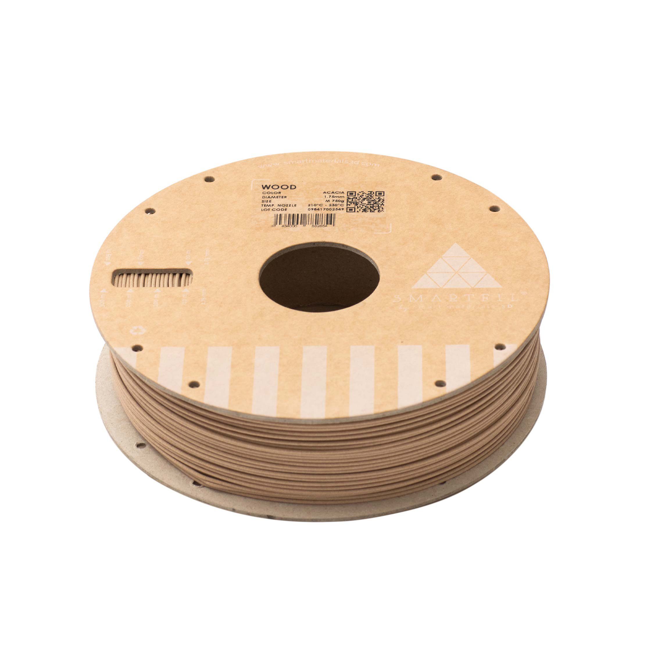 Filamento PLA Wood con carga de madera real para un acabado cƔlido y natural. Disponible en color Acacia, diƔmetro 1.75 mm, bobina de 750g.