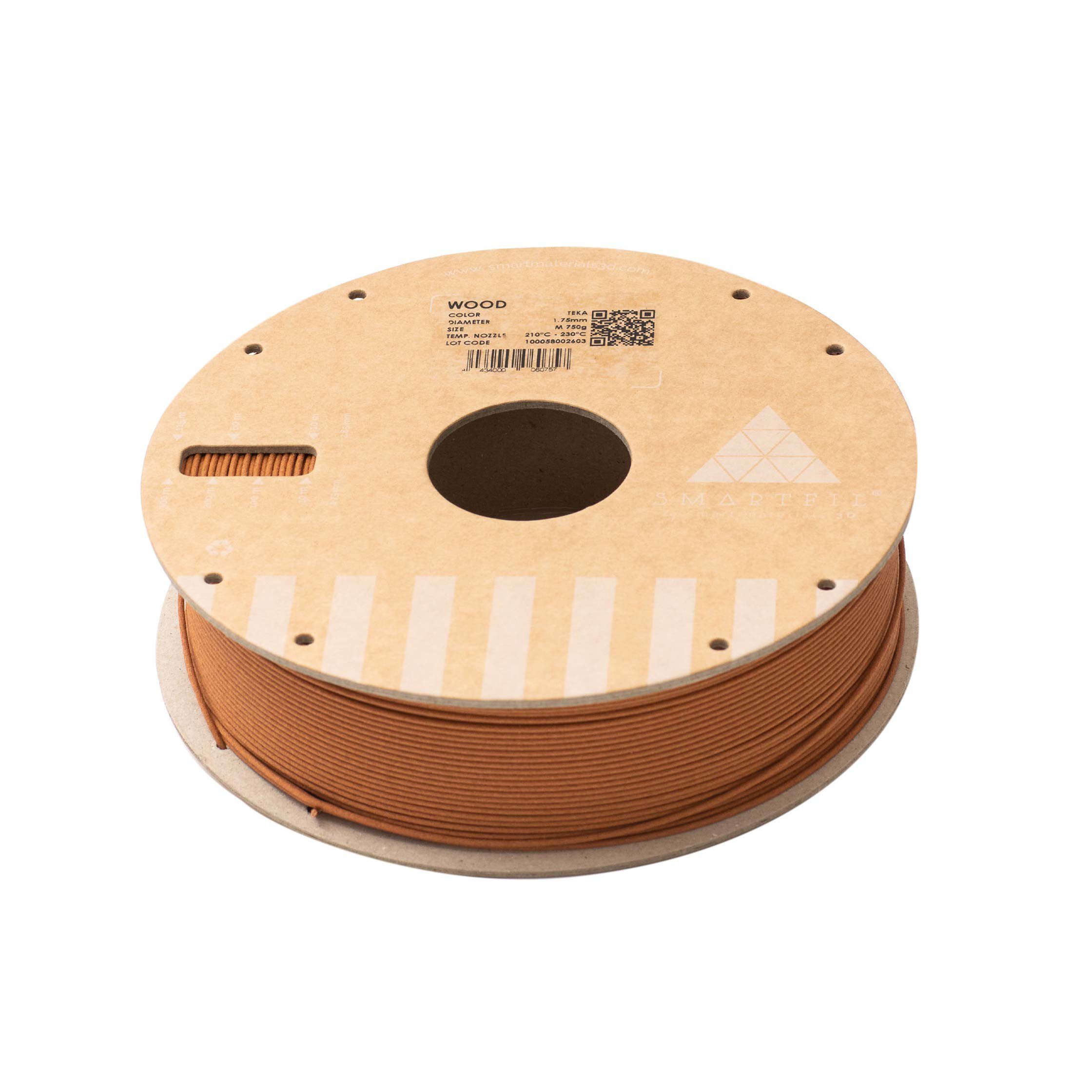 Filamento PLA Wood con carga de madera real para un acabado cƔlido y natural. Disponible en color Teka, diƔmetro 1.75 mm, bobina de 750g.