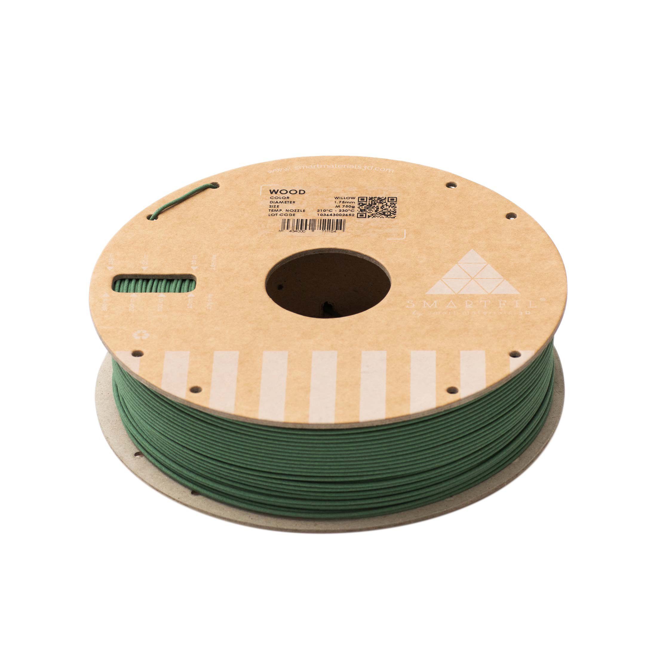 Filamento PLA Wood con carga de madera real para un acabado cƔlido y natural. Disponible en color Willow, diƔmetro 2.85 mm, bobina de 750g.